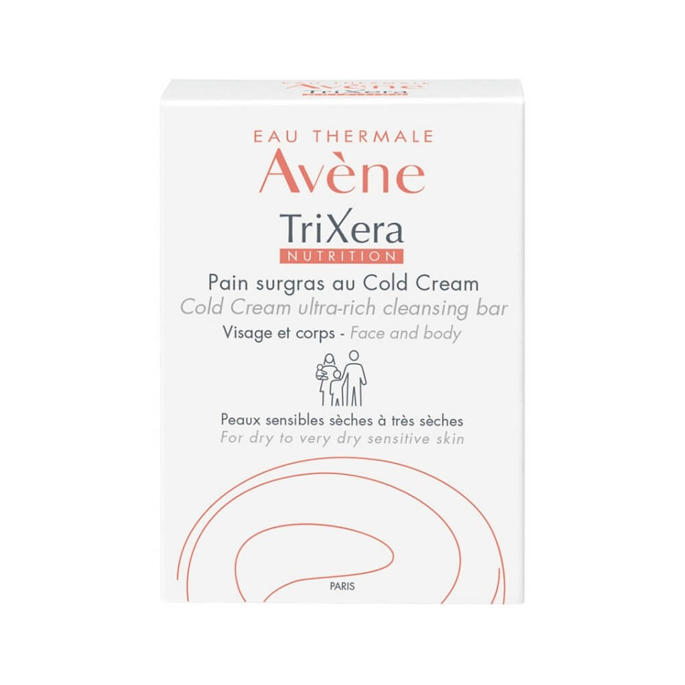 Avene TRIXERA permet de Nettoyer en douceur et respecter l’intégrité cutanée (non desséchant)., Ce pain Protège et nourrit grâce aux propriétés nutritives et adoucissantes du Cold Cream.